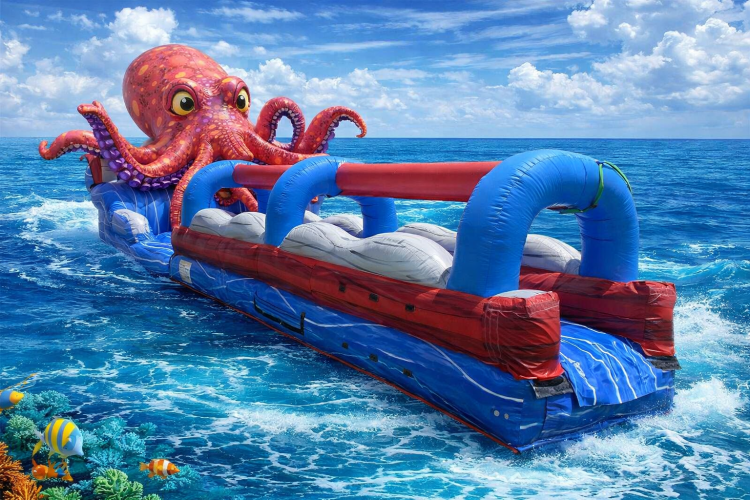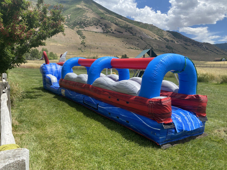 The 32-foot long Ocean Battle Slip N Slide features a long wet ride with water cascading along to keep it slippery and perfect for sliding. The water collects at the end of the pool for a BIG splash landing. Connect a water hose to the bladder system in the middle of the unit for hours of wet sliding fun. Also our delivery time frame is between 8am-12pm and pick up time is between 8am-2pm on and the following day. If you need specific time frame please feel free to call us at 435-580-934