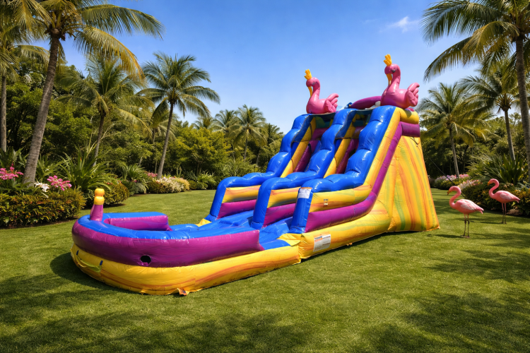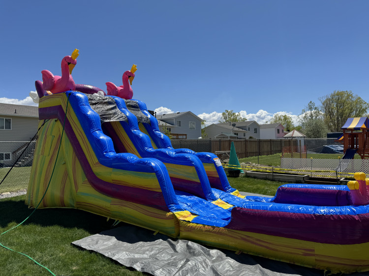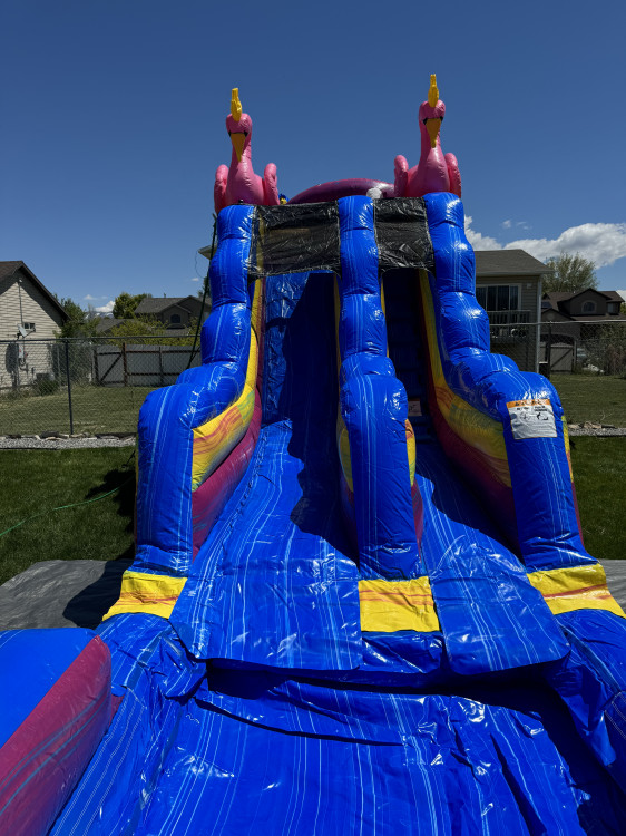 Pinky flamingo is 15 ft giant climber slide is a first choice for children and adults to have a splash fun party on sunny days. This water slide sits 8 feet tall and 28 feet long; this waterslide ensures a wow factor for big kids!. NO ADULTS.