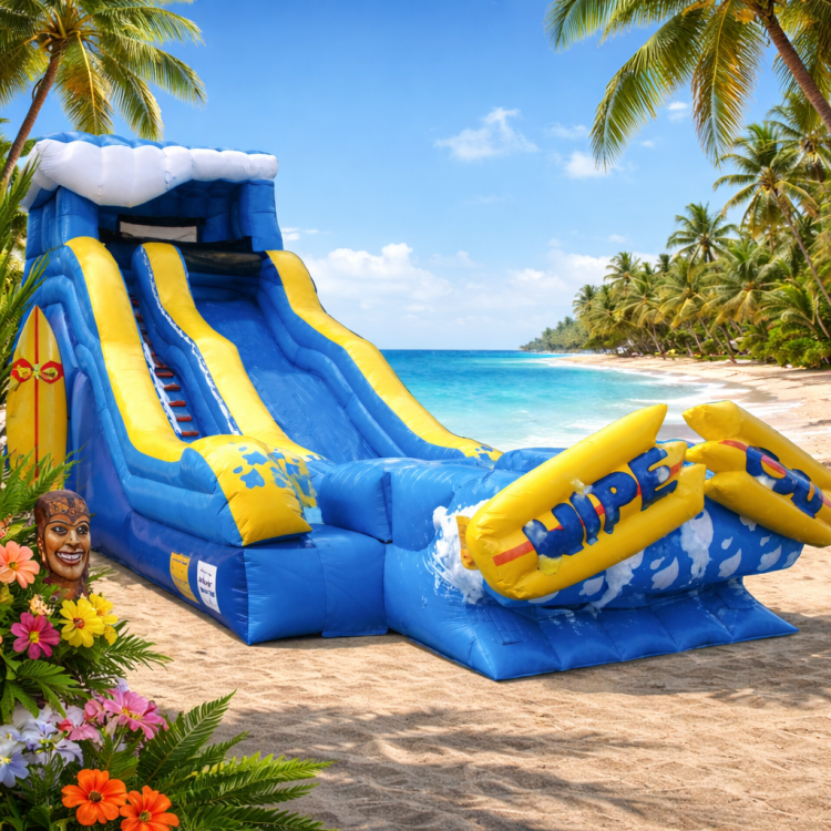 Let's go surfing and catch a wave of profits with our Wipe Out XL Water Slide! This amazing slide features an undulating slide lane, a splash pool in the landing area, a built-in soaking system and water drains for easier logistics and maintenance.