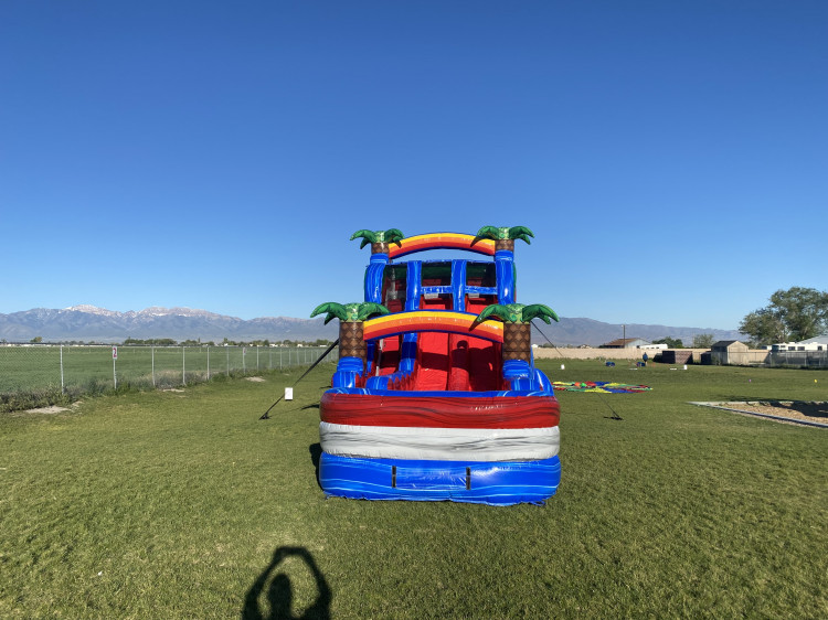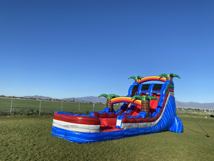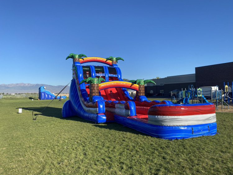 Including powerful red, blue, and light grey colors and features two large palm trees at the top and base of the waterslide. This waterslide also features extended slide lanes. size is 20ft tall 40ft long 19ft wide.